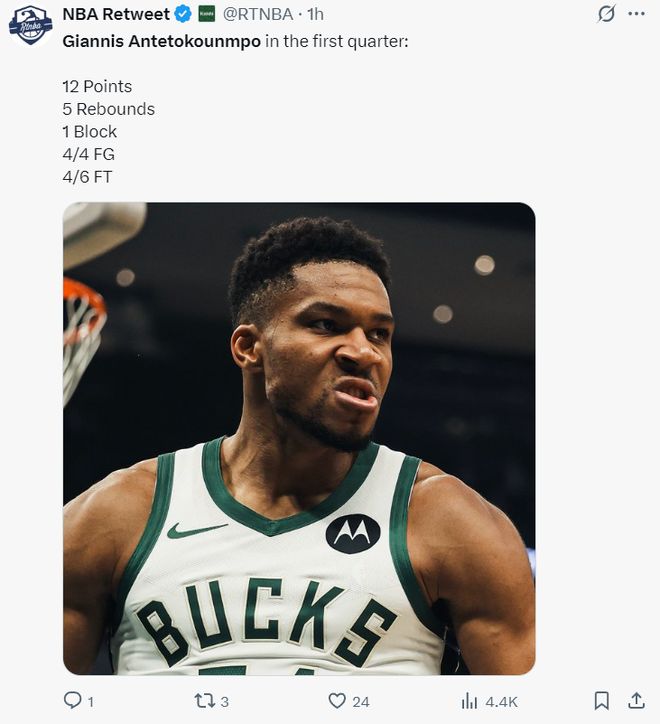 希腊怪兽扬尼斯在NBA真的恐怖,首节9分钟里,4中4,拿到12分5篮板1助攻,篮下的暴扣非常轻松,字母哥的对抗非常之强。